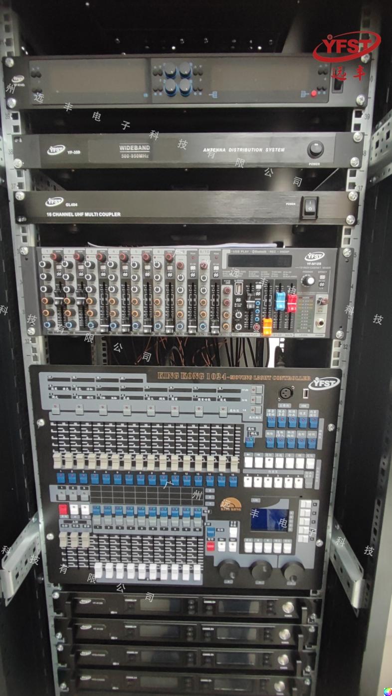 此次音频灯光设备,包括有:200W LED 聚光灯(YF-143)、18x15W五合一 帕灯(YF-077)、专业音箱(LA-206)、功率放大器(YF-CA400)、真分集U段集会系统(YF-614D)、电源时序器(YF-P8A)、音频处理器(YF-DX48)等设备。